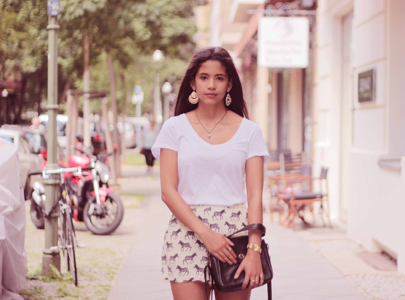 Die Hose besticht durch die hohe Taille, vor allem aber durch das Zebramuster. Damit der Hose die Aufmerksamkeit auch erhalten bleibt, kombiniere ich Sie mit einem simplen, weißen T-Shirt und meinen heiß geliebten TOMS. Viel Goldschmuck dazu und – tadaa! – mein perfekter Look für einen heißen Sommertag ist fertig. Ich wünsche euch ein schönes Wochenende mit hoffentlich besserem Wetter!